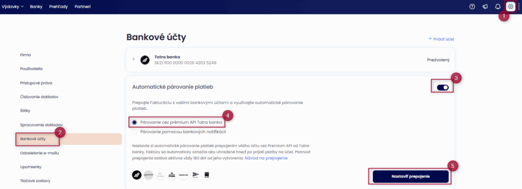 - V nastaveniach firmy A – evidencia Bankové účty, aktivujete možnosť Automatického párovania platieb, zvolíte možnosť Párovanie cez prémium API Tatra banka a zvolíte možnosť Nastaviť prepojenie. Následne budete presmerovaný do prostredia Open API Tatrabanky. Pokiaľ bankový účet prepájate prvýkrát a nie ste registrovaný, postup ako sa zaregistrovať nájdete tu: Prepojenie KROS Fakturácie s bankou pre automatické spracovanie pohybov na účte.