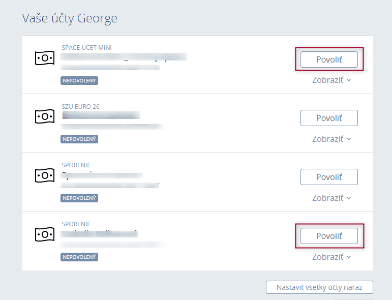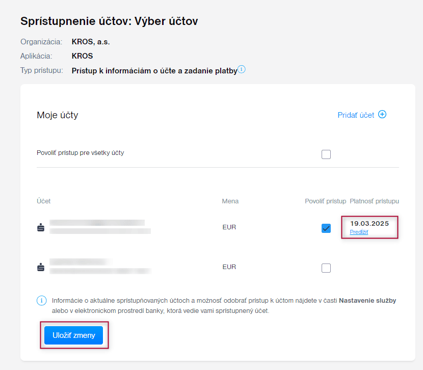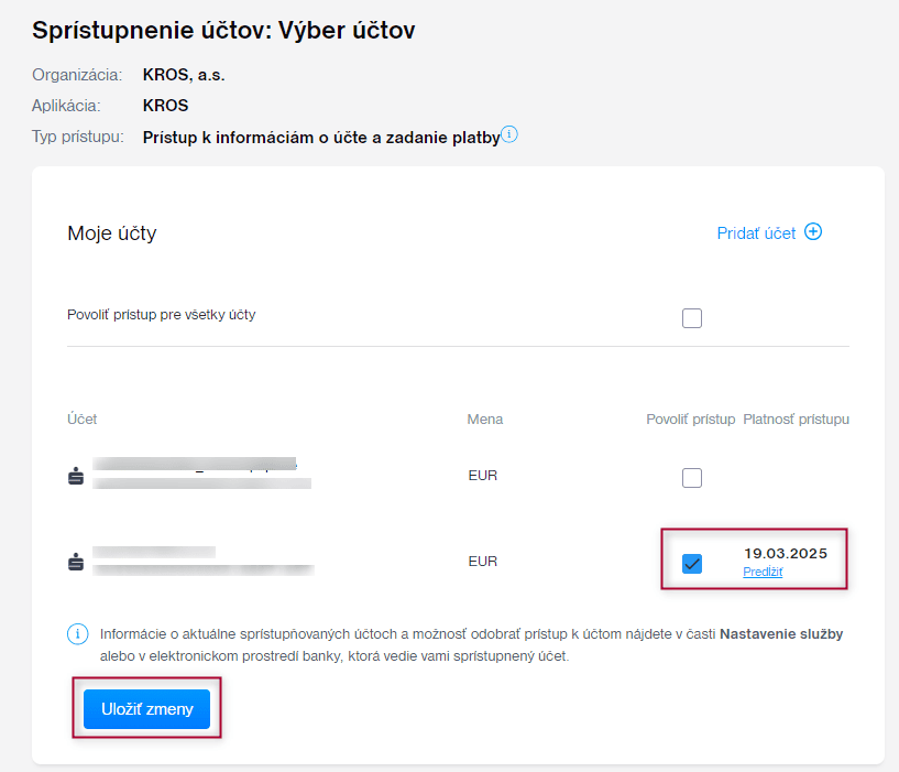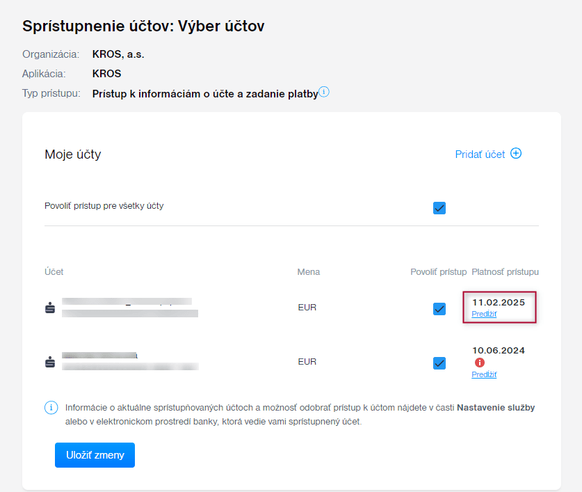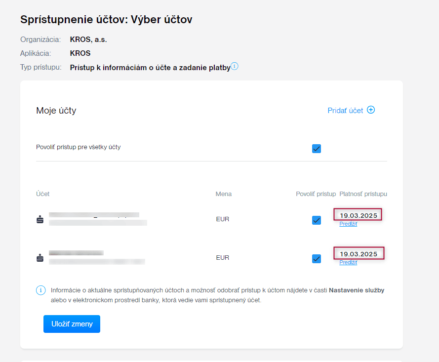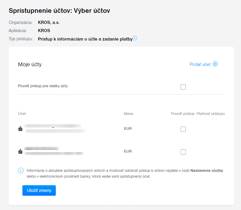 Ak máte v banke na jednom konte viac bankových účtov, ktoré chcete v KROS Fakturácii prepojiť voči viacerým firmám (jeden účet voči jednej firme, iný účet voči inej firme, pričom oba bankové účty spravujete jedným internetbankingom), je potrebné pri prepájaní – v momente prepojenia do vášho internetbankingu – povoliť všetky účty, ktoré chcete voči našim aplikáciám mať prístupné (vo všetkých firmách KROS Fakturácie – nie len účty pre tú konkrétnu firmu, kde si prepojenie práve nastavujete).