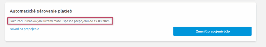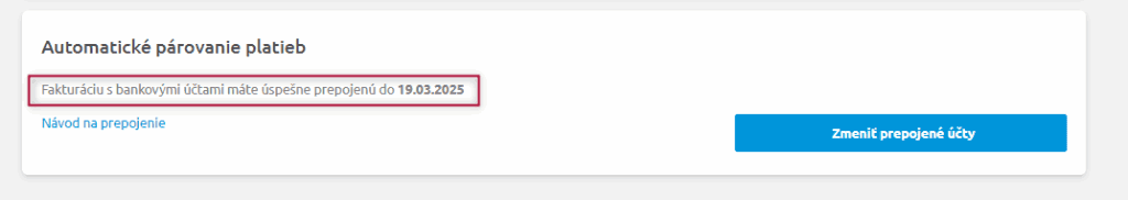 - Po úspešnom prepojení účtu budete presmerovaný naspäť do KROS Fakturácie, kde uvidíte dátum platnosti prepojenia. Platnosť prepojenia je 180 dní.