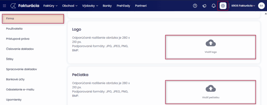 Chcete mať na svojich dokladoch firemné logo a pečiatku? Po prihlásení sa do aplikácie ich pridáte jednoducho cez Nastavenia – Firma – Vlož logo/Vlož pečiatku. Pred tým je potrebné si obrázky upraviť na požadovaný rozmer a formát. Odporúčané rozlíšenie obrázka je 280 x 210 px a podporované formáty sú: JPG, JPEG, PNG, BMP.