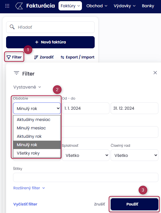 Vo Fakturácií sa v novom roku automaticky zobrazia len faktúry aktuálneho roka. Ak si potrebujete pozrieť aj staršie doklady, vľavo hore nájdete Filter, kde si môžete zvoliť Obdobie – Minulý rok alebo Všetky roky.