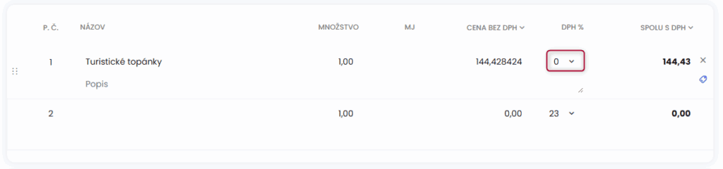 Pri zadávaní položky je automaticky prednastavená nulová sadzba DPH.