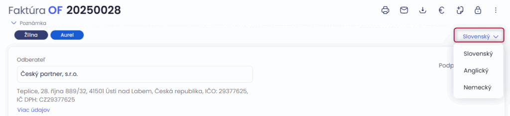 Doklad v cudzom jazyku je pre zahraničného partnera samozrejmosťou. Po vytvorení dokladu stačí prepnúť jazyk v pravom hornom rohu na angličtinu, alebo nemčinu.
