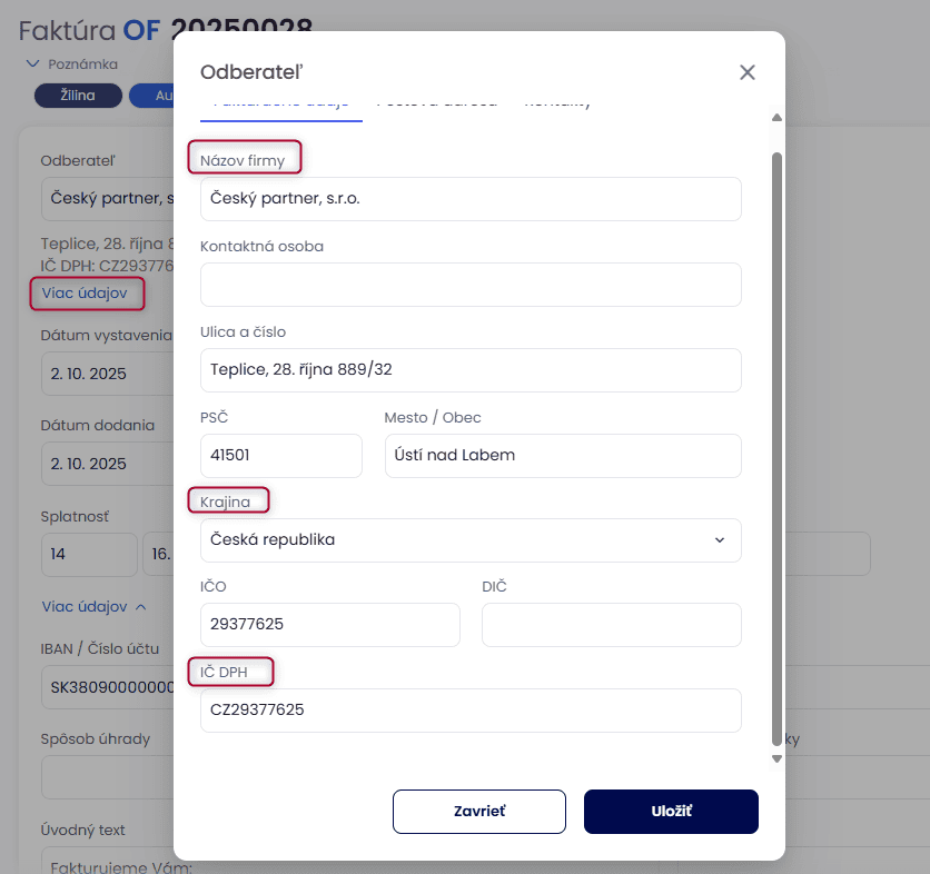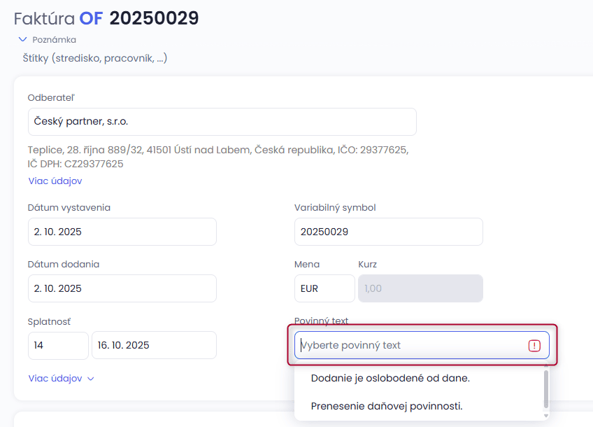 Pri tvorbe dokladu je potrebné zadať fakturačné údaje partnera tak, aby bol uvedený štát so sídlom podnikateľa a IČ DPH v správnej kolónke.