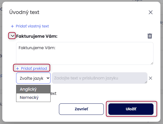 Všetky názvy polí sa preložia do vybraného jazyka. Ak však máte vytvorené vlastné texty, napríklad pri úvodnom, či záverečnom texte, je potrebné pridať k textu preklad.