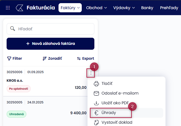 - krok: Pridanie úhrady na zálohovú faktúru buď manuálne, alebo v prípade prepojenia s bankou sa priradí úhrada k preddavkovej faktúre automaticky.