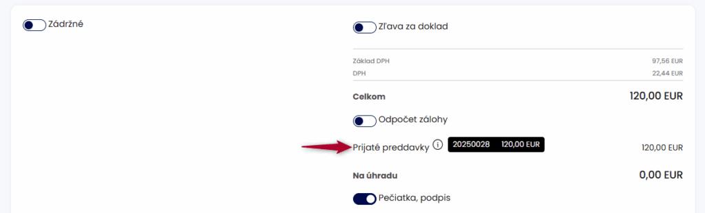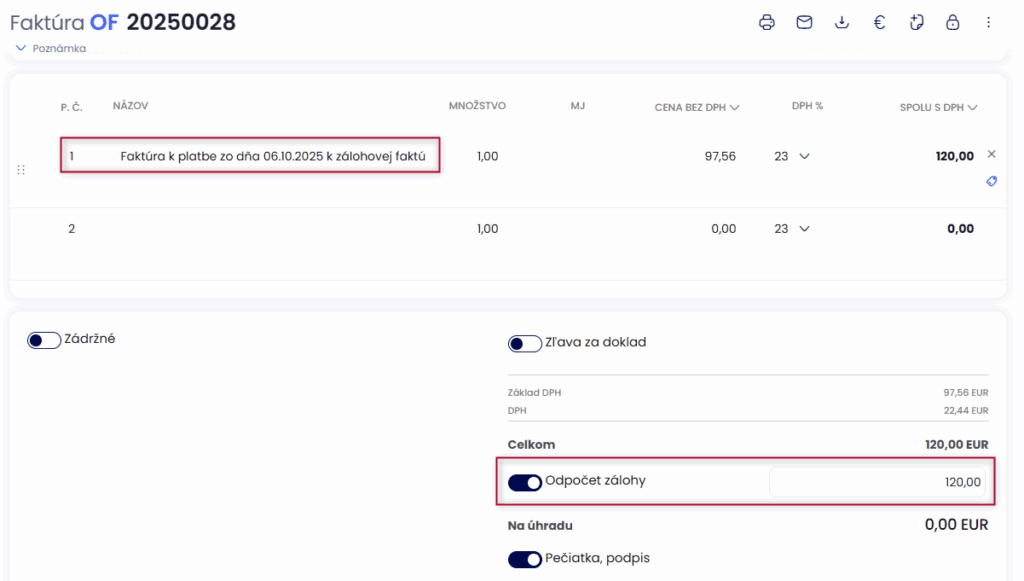 V prípade, že nevystavujete zálohovú faktúru a zákazník vám pošle len úhradu preddavku, je potrebné vystaviť daňový doklad ručne. V sumárnej časti faktúry zapnete voľbu Odpočet zálohy a doplníte sumu zálohy.
