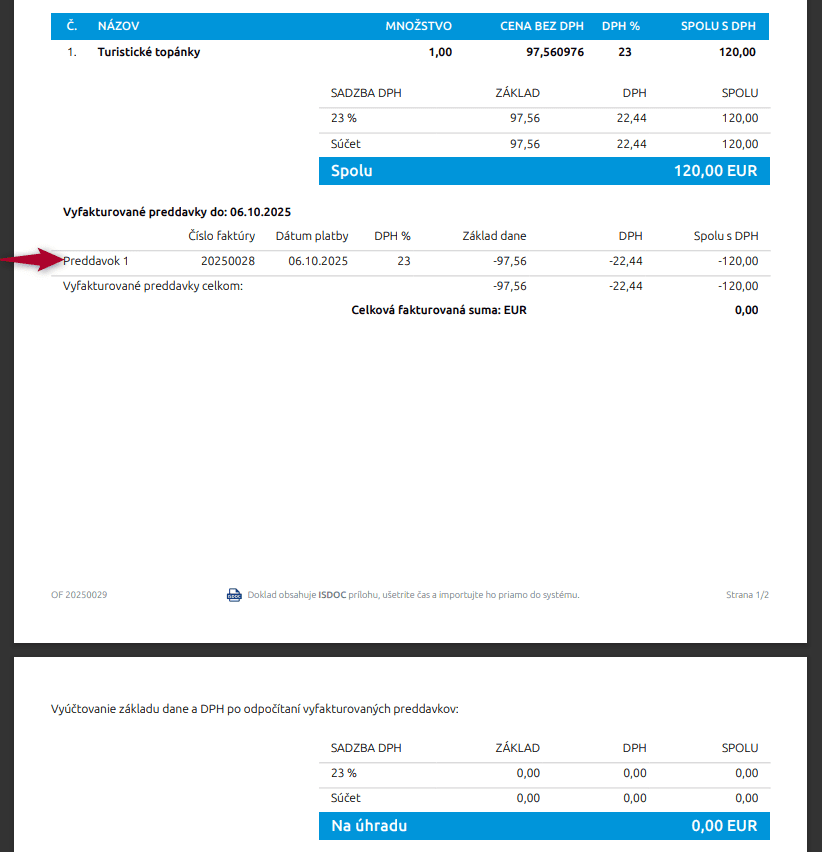 Na výslednej tlačovej zostave sa vám zobrazí tabuľka Vyfakturovaných preddavkov.