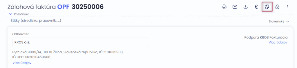 V evidencii Zálohové faktúry vyhľadáte konkrétnu zálohovú faktúru, z ktorej chcete vyhotoviť daňový doklad. Otvoríte si ju a následne zvolíte voľbu Vystaviť doklad – ikona listu v hornej časti formulára, prípadne v ľavej časti na faktúre cez tri bodky.