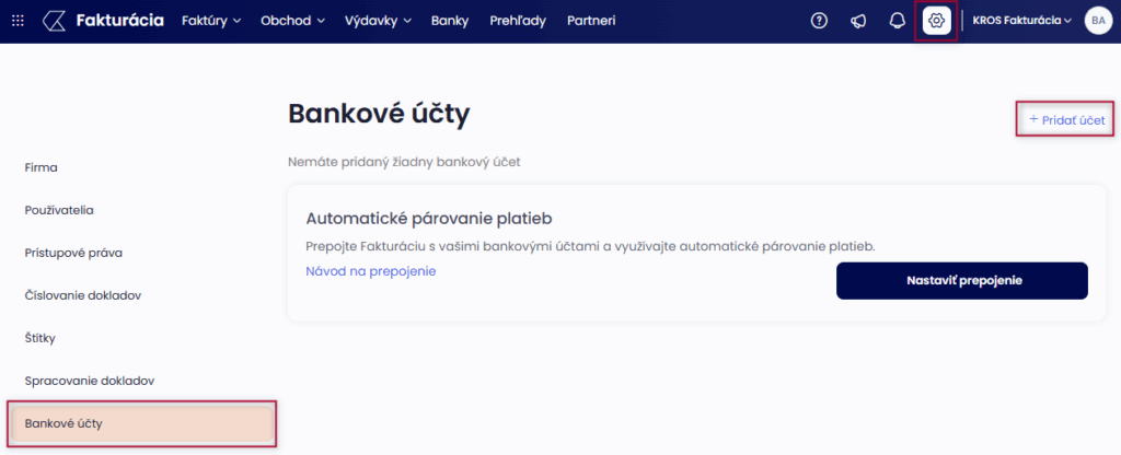 Aby sa QR kód zobrazil na faktúre, je potrebné mať na doklade uvedené informácie o vašom bankovom účte. Tieto údaje vyplníte v nastaveniach firmy – evidencia Bankové účty – možnosť + Pridať účet