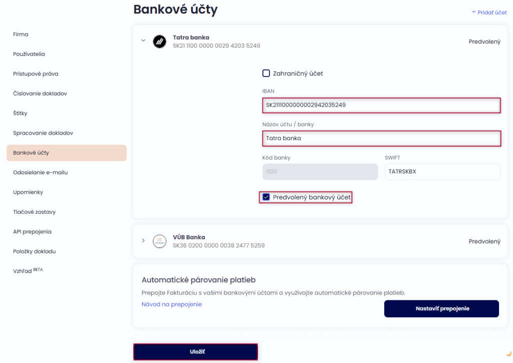 Ak máte viac bankových účtov, je možné nastaviť jeden účet ako predvolený (na doklad sa doplní automaticky). Bankový účet potvrdíte cez voľbu Uložiť.