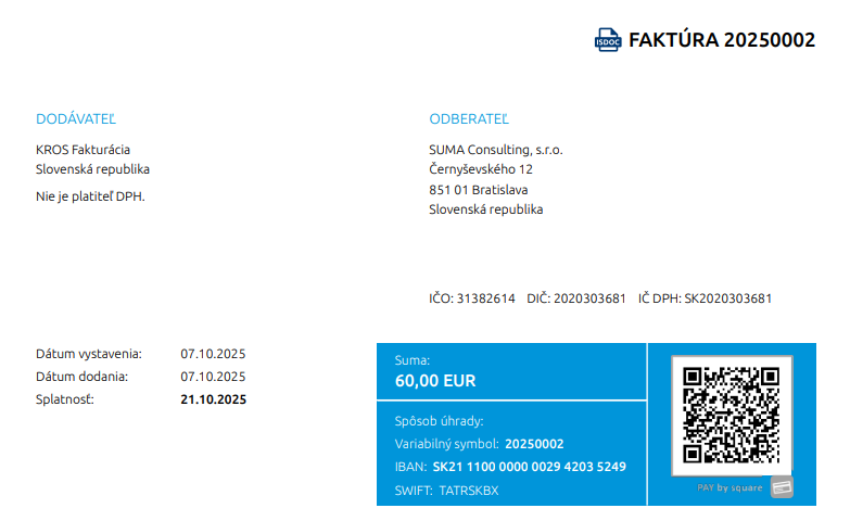 - QR kód je podporovaný pre faktúry vystavené v mene EUR s kladnou sumou.
