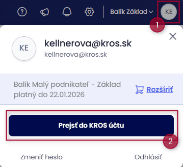 Ak neviete, či využívate funkciu automatickej obnovy, skontrolujete si to priamo vo svojom KROS účte. Do KROS účtu máte prístup priamo z aplikácie KROS Fakturácia. V pravom hornom roku aplikácie, kliknete na farebný symbol s iniciálami a zvolíte možnosť Prejsť do KROS účtu.
