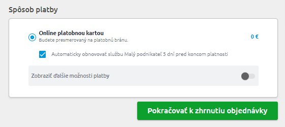 Automatickú obnovu si nastavíte priamo pri kúpe alebo obnove balíka v KROS účte. V kroku Spôsob platby, sa vám automaticky prednastaví možnosť Online platobnou kartou so zapnutou službou Automatická obnova.