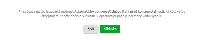 V ďalšom kroku vás KROS účet upozorní na zapnutú automatickú obnovu. Pre jej potvrdenie zvolíte možnosť Súhlasím a pokračujete v objednávke.