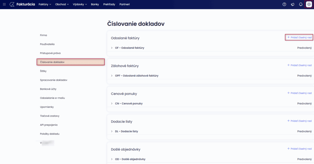 Cez možnosť číslovanie dokladov, viete prispôsobiť číslovanie dokladov jednotlivých evidencií podľa svojich potrieb. Zároveň je možné pridať ďalší číselný rad a nastaviť konkrétny číselný rad ako predvolený.