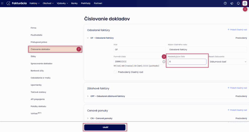 Číslovanie dokladov nájdete v nastaveniach – záložka číslovanie dokladov