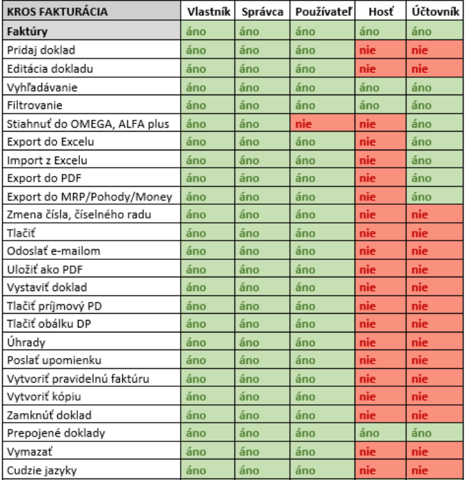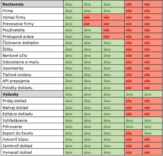 Prístupové práva je možné určiť pre role: Používateľ, Účtovník a Hosť. Je tak potrebné už na začiatku určiť ďalšiemu užívateľovi správnu rolu, ktorej následne môžete zamedziť prístupy do jednotlivých evidencii.
