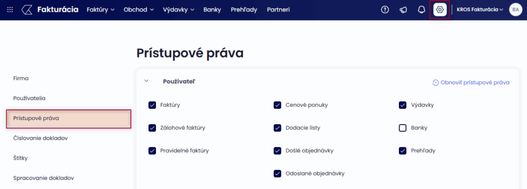 Rola Vlastník bola automaticky priradená používateľovi, ktorý založil firmu v KROS Fakturácií, nemožno ho vymazať ani mu meniť role. Vlastník a Správca môžu pridávať a meniť role ostatným používateľom.