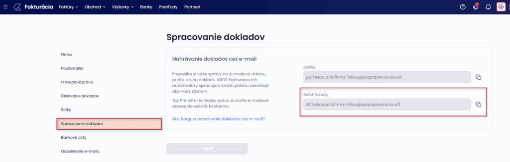V časti Nastavenia – Spracovanie dokladov nájdeme preddefinované e-mailové adresy, na ktoré je potrebné preposielať doklady. Ak chceme zber dokladov ešte viac zefektívniť, môžeme túto zbernú e-mailovú adresu poskytnúť priamo svojim dodávateľom. Nielenže sa tak zníži riziko straty dokladov, ale urýchli sa aj proces ich odovzdávania.
