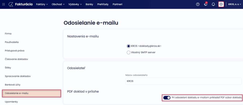 Cez Nastavenia – Odosielanie e-mailu v časti PDF doklad v prílohe zvoľte voľbu „Pri odosielaní dokladu e-mailom prikladať PDF súbor dokladu“.