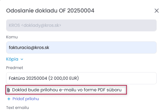 Pri samotnom odoslaní faktúry e-mailom bude doklad automaticky prílohou v PDF formáte.