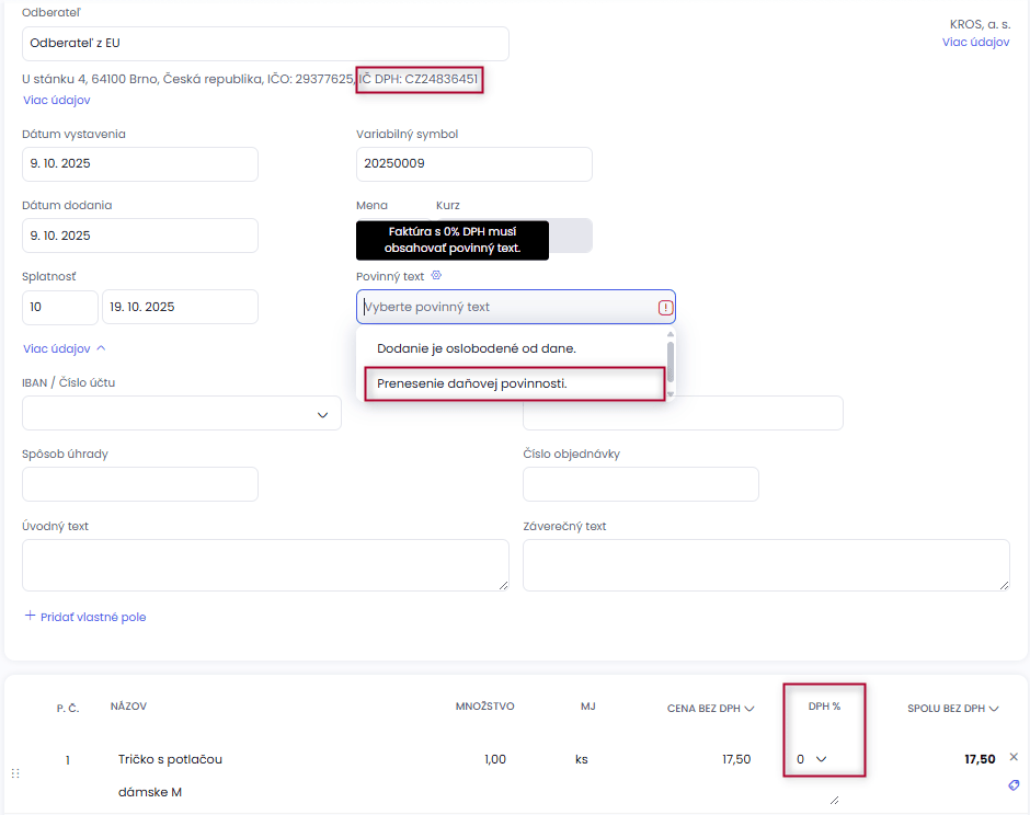 Keď vyberiete partnera so zahraničným IČ DPH (s iným prefixom ako SK):