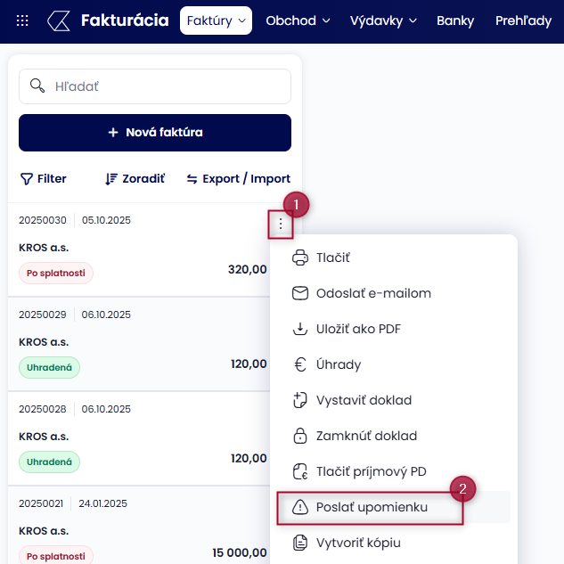 V zozname faktúr si zvolíte faktúru, ku ktorej chcete poslať upomienku (faktúra musí byť buď neuhradená, prípadne čiastočne uhradená a po splatnosti), následne kliknete na tri bodky a potvrdíte voľbu Poslať upomienku.