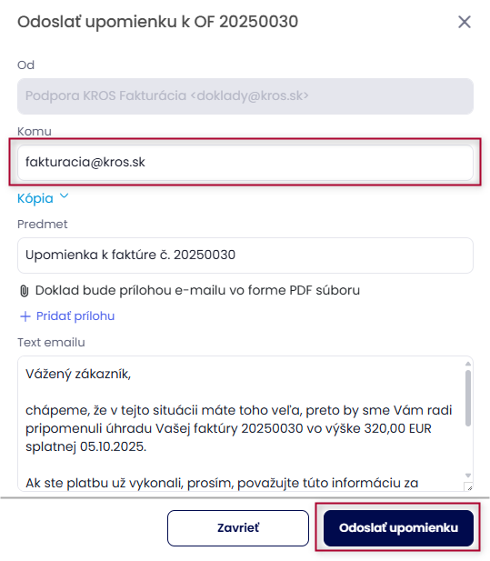 Pred odoslaním upomienky je potrebné vyplniť e-mailovú adresu, na ktorú chcete upomienku poslať. Pokiaľ máte e-mail k partnerovi vyplnený v záložke Partneri, vyplní sa automaticky. Text upomienky je editovateľný. Nakoniec už len stačí Odoslať upomienku.