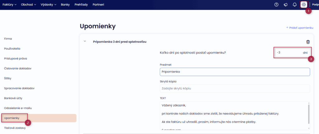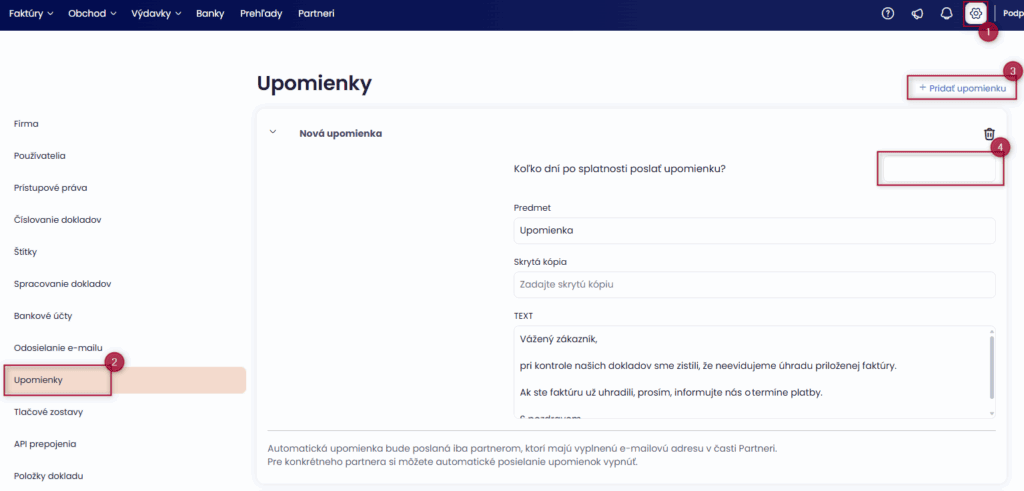 V nastaveniach firmy, v časti Upomienky si nastavíte rôzne úrovne upomienok a automatizujete ich posielanie. Určite si, koľko dní po splatnosti chcete upomienku poslať, k tomu príslušný text a celé nastavenie uložíte.