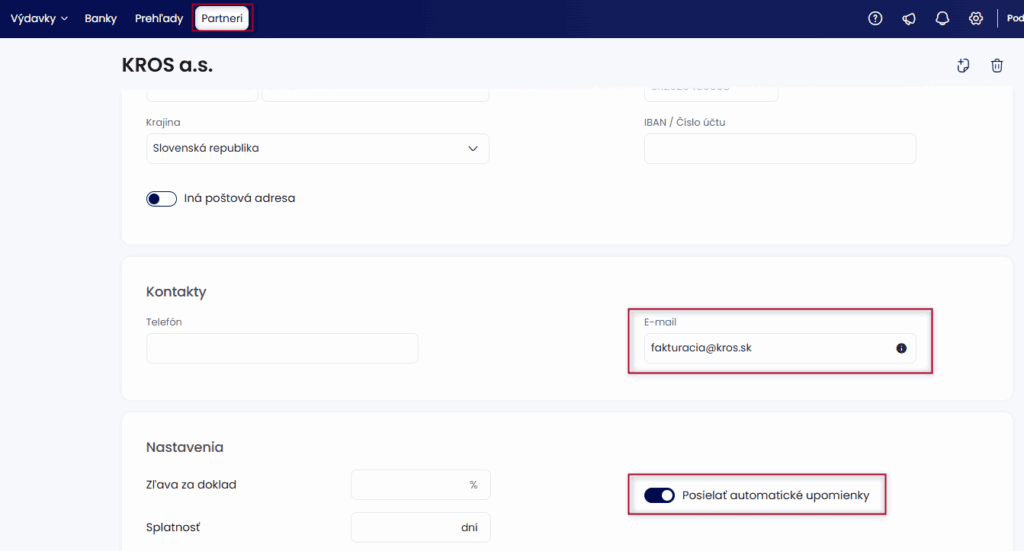 Aby sa automatická upomienka partnerovi odoslala, je potrebné mať nastavenú e-mailovú adresu na karte partnera. Pokiaľ nechcete vybraným partnerom upomienky posielať, stačí vypnúť voľbu Posielať automatické upomienky. |