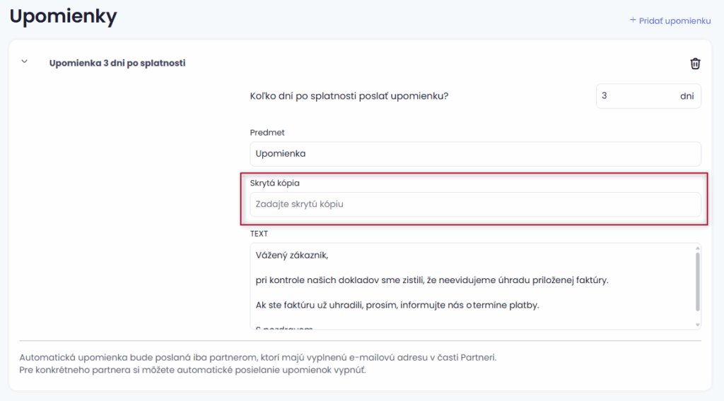 Evidencia odoslaných upomienok sa v aplikácii nenachádza. Po jej odoslaní sa v aplikácii nearchivuje. Pri nastavení upomienok vám odporúčame vyplniť pole Skrytá kópia s vašim e-mailom. V tom prípade, budú upomienky automaticky zaslané aj na váš e-mail. |