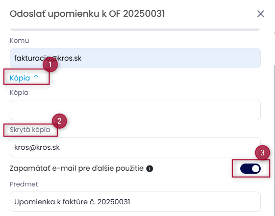 Pri manuálne odoslanej upomienke nastavíte skrytú kópiu priamo pri jej odoslaní: