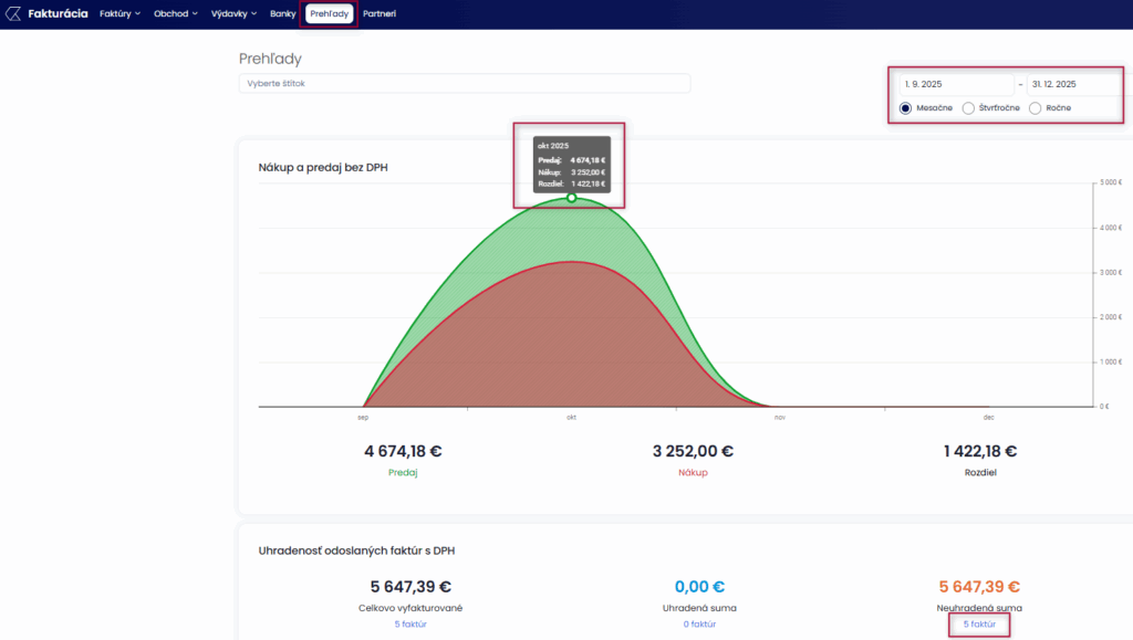 V menu Prehľady vpravo hore si zvoľte obdobie, ktoré vás zaujíma. V grafickom zobrazení rýchlo získate obraz o výške fakturácie a jej zmenách v priebehu vybraného obdobia. Jednoducho zmenou dátumov si môžete porovnať ako sa vám s obchodom darí oproti rovnakému obdobiu minulého roka.