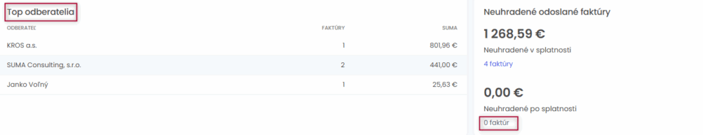 V spodnej časti Prehľadov nájdete vašich Top odberateľov zoradených podľa hodnoty fakturácie za vybrané obdobie.