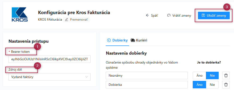 - V časti nastavenie prístupu vyplníme bearer token, kde zadáme API token, vygenerovaný v KROS Fakturácii a Zdroj dát, v ktorom vyberieme evidenciu, odkiaľ sa majú doťahovať údaje do aplikácie Chameleoon. Na výber máme Vydané faktúry, Zálohové faktúry alebo Došlé objednávky. Vykonané zmeny uložíme.