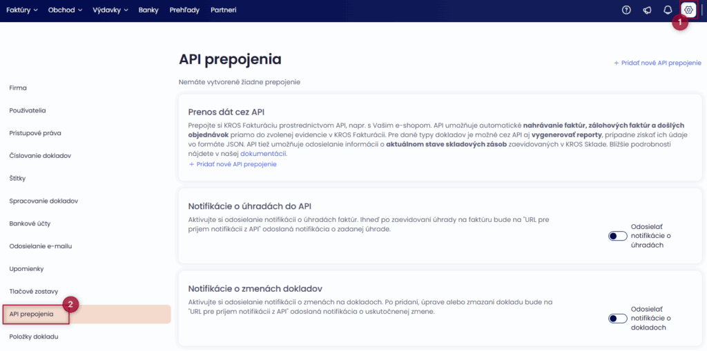 Možnosť nastavenia API prepojenia nájdete v nastaveniach firmy – API prepojenia.