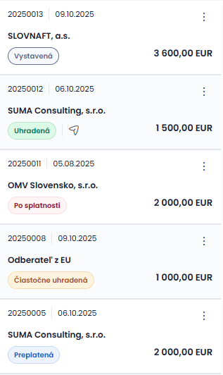 Vľavo v zozname faktúr je slovné vyjadrenie či je faktúra Vystavená, Uhradená, Po splatnosti, Čiastočne uhradená, Preplatená.