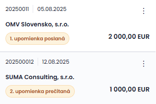 Ak ste klienta na neuhradenú faktúru po splatnosti upozornili, môžete vidieť či bola upomienka poslaná alebo už aj videná, samozrejme aj s poradovým číslom upomienky.
