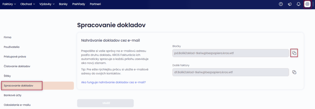 V časti Nastavenia – Spracovanie dokladov nájdete preddefinované e-mailové adresy, na ktoré je potrebné preposielať doklady. Ak chcete zber dokladov ešte viac zefektívniť, môžete túto zbernú e-mailovú adresu poskytnúť priamo svojim dodávateľom. Nielenže sa tak zníži riziko straty dokladov, ale urýchli sa aj proces ich odovzdávania.