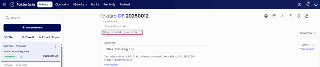 Jednotlivým dokladom evidovaným v KROS Fakturácii je pre lepšiu prehľadnosť možné priradiť Štítky (tzv. tagy). Sú rýchlym nástrojom na roztriedenie a usporiadanie dokladov do skupín. Štítkom môže byť napr. kľúčové slovo alebo oblasť, ktorá vystihuje daný doklad a zaraďuje ho do určitej skupiny. Priradiť štítky môžeme napr. dokladom, ktoré súvisia s konkrétnou zákazkou, prislúchajú k danému stredisku či partnerovi a pod.