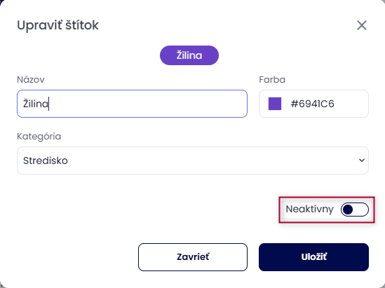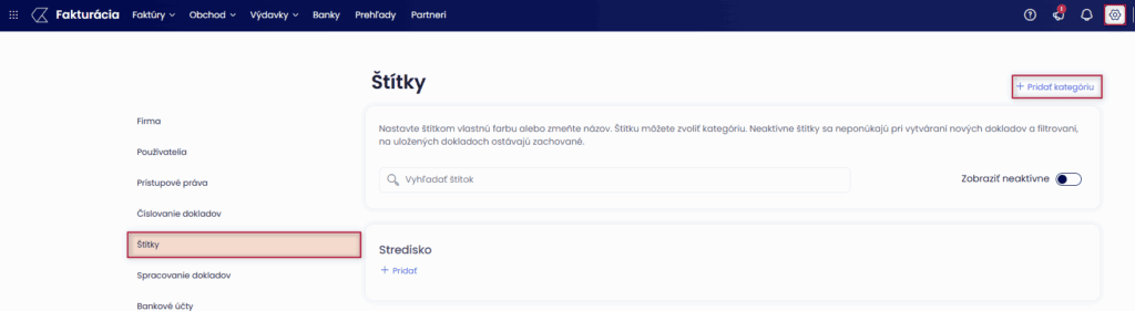 V prípade, že štítok už nebudeme pri práci ďalej používať, cez Nastavenia v záložke Štítky mu zaklikneme príznak Neaktívny. Následne sa nebude ponúkať pri evidovaní dokladov.
