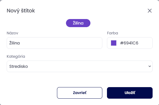 Štítky vytvárame pod kategóriami cez možnosť Pridať. Vo formulári dopĺňame názov, upravujeme farbu a vyberáme kategóriu, do ktorej bude štítok zaradený.