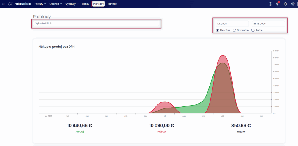 V záložke Prehľady si môžeme zobraziť rýchly prehľad nákupov a predajov podľa štítkov. Po výbere štítku, prípadne i kombinácie viacerých, sa graf automaticky aktualizuje. Taktiež si môžeme zobraziť prehľad za zvolené obdobie nastavením príslušných dátumov, prípadne zobraziť mesačný, kvartálny alebo ročný graf.