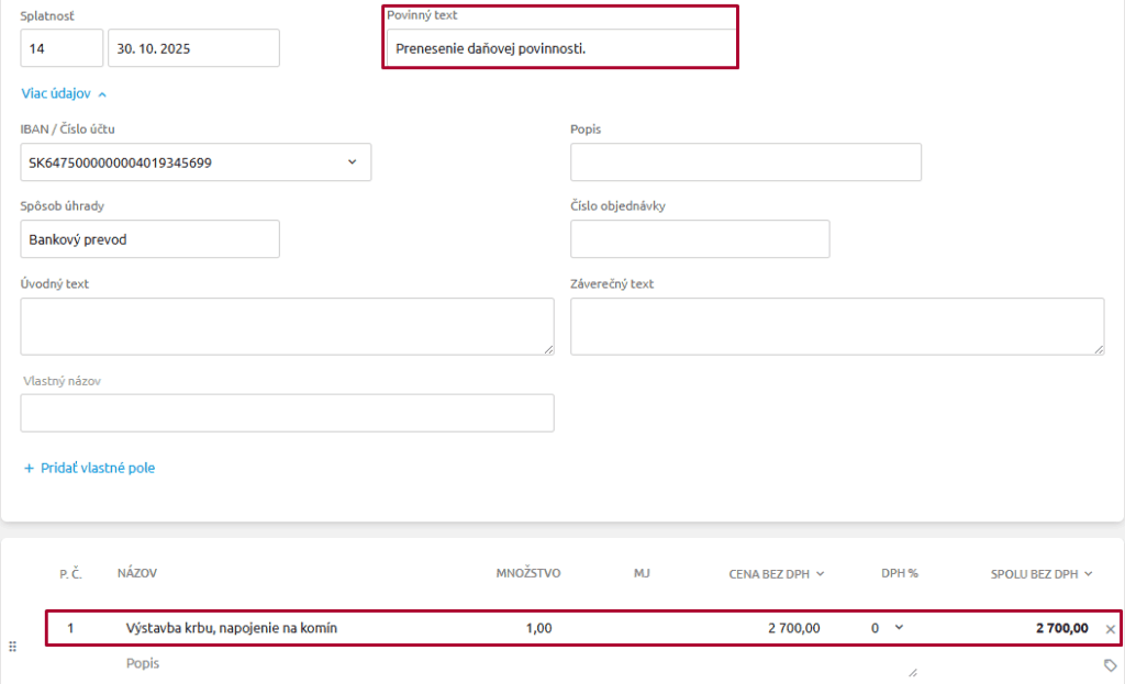 Ste platiteľ DPH a vystavujete faktúru, napríklad za stavebné práce, inému platiteľovi DPH? Na faktúre v takom prípade použijete nulovú sadzbu DPH a uvediete povinný text Prenos daňovej povinnosti.