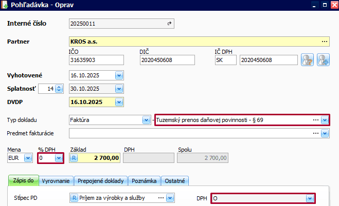 Faktúra za stavebné práce bude naimportovaná s typom dokladu – Faktúra – Tuzemský prenos daňovej povinnosti – § 69, v 0 % sadzbe DPH, s riadkom DPH O.