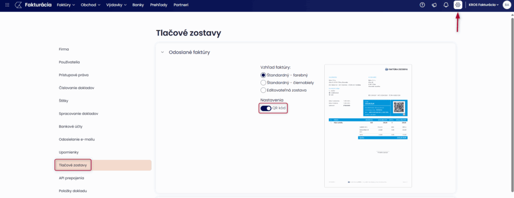 Cez Nastavenia si zvoľte v časti Tlačové zostavy Štandardný – farebný, Štandardný – čiernobiely vzhľad Vašich faktúr, či zálohových faktúr, alebo si v rámci platených balíkov PRO a FLEXI nastavte vlastný vzhľad faktúr pomocou Editovateľnej zostavy. Ako pracovať s editovateľnou zostavou si môžete prečítať v našom návode.