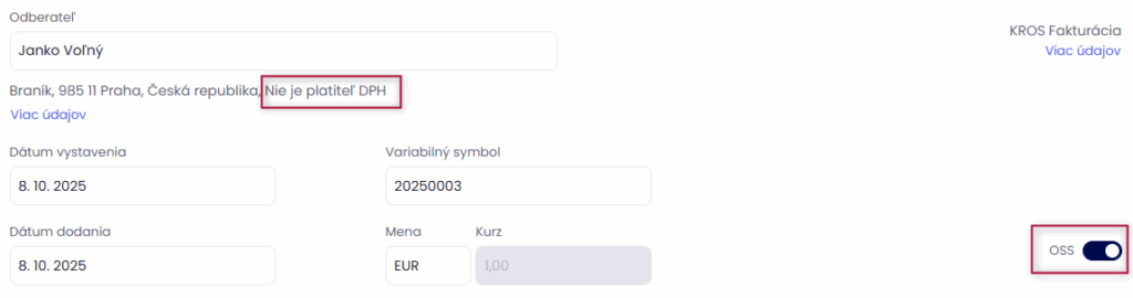 Pri vystavení faktúry pre odberateľa bez IČ DPH bude automaticky zapnuté OSS. Dôležité je, aby bol štát na partnerovi v KROS Fakturácií zadaný rovnako ako v číselníku OMEGY (v našom prípade Česko).