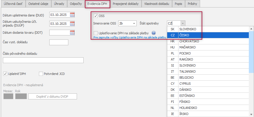 V záložke Evidencia DPH si môžete, v prípade potreby, upraviť Smerovanie OSS do príslušného oddielu.
