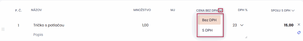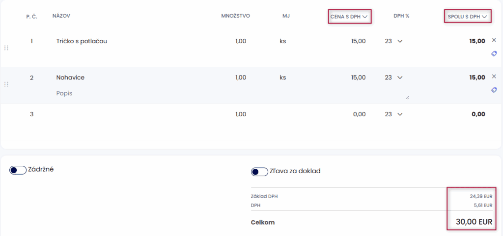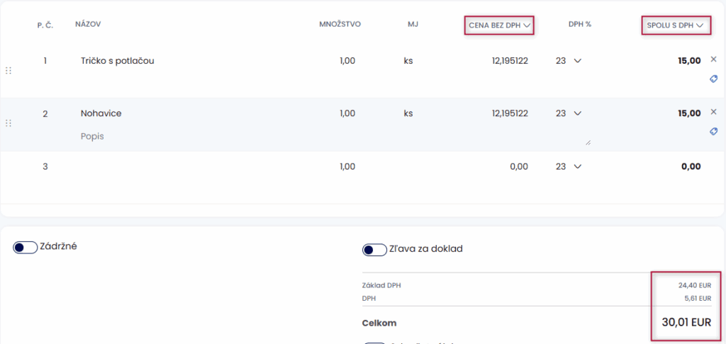 Ak vám nesedí celková suma na doklade so súčtom položiek s DPH je to spôsobené rôznym spôsobom výpočtu DPH. Zaokrúhlenie však viete ovplyvniť prepnutím stĺpca Cena bez DPH na Cena s DPH.